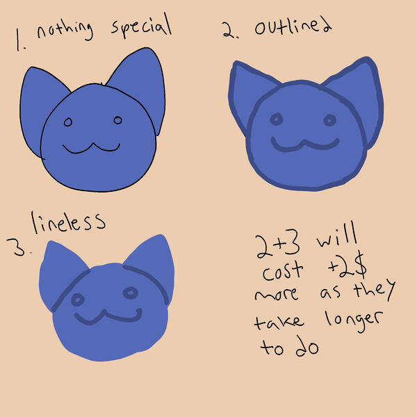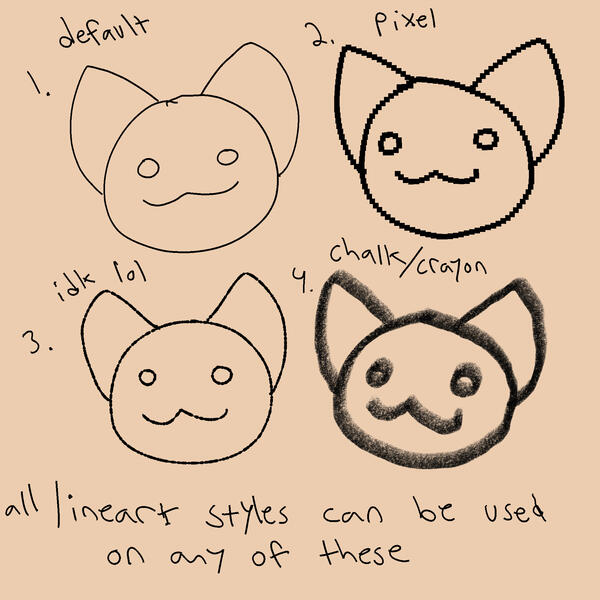 These are the different lineart styles I draw my art in. If you're getting a commission from me please specify which of these styles you want! Outlined and lineless will cost a bit extra ($2) as they take longer.I also have different styles i use, such as crayon brushes or pixel art brushes. If you'd want one of these specifically, let me know, otherwise i'll stick with default. All styles listed can be used at no extra cost.